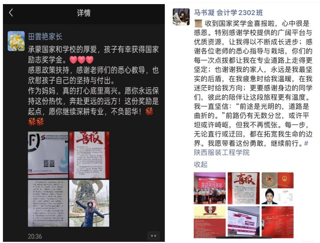 “太惊喜了!没想到学校会专门把喜报寄到家里,全家人都围着看了好几遍!”刚收到喜报的服装学院学生家长特意给辅导员发来消息分享喜悦。家长坦言,平时孩子只报喜不报忧,看到喜报上学校对孩子的肯定,心里既骄傲又踏实。不少家长还在社交平台分享这份喜悦,配上喜报合影和荣誉照片,留言“感谢陕服的悉心培养,孩子的努力值得这份荣光”,引发了一波温馨的“荣誉接力”。