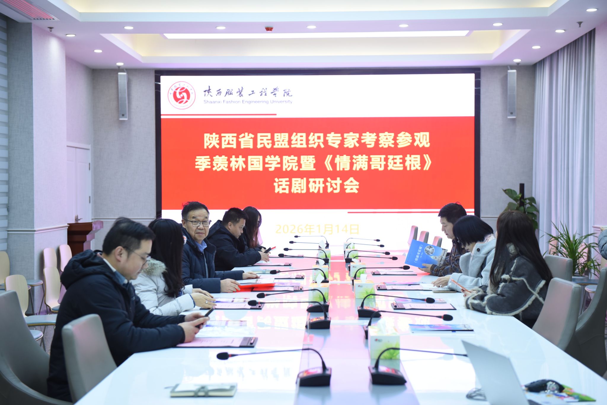 元月14日,话剧《情满哥廷根》研讨会在我校季羡林国学院一楼会议室举行,民盟陕西省委专家张慕瑶、高波、鲁小艳一行考察参观季羡林纪念馆、季羡林特藏馆后参加了研讨会。会议由校长姜寿山主持,民盟陕西服装工程学院支部主委王伟,服装学院教师吴博、王芳蕊,党政办文笛、康晓婷,国学院习如雪等参加了研讨会。