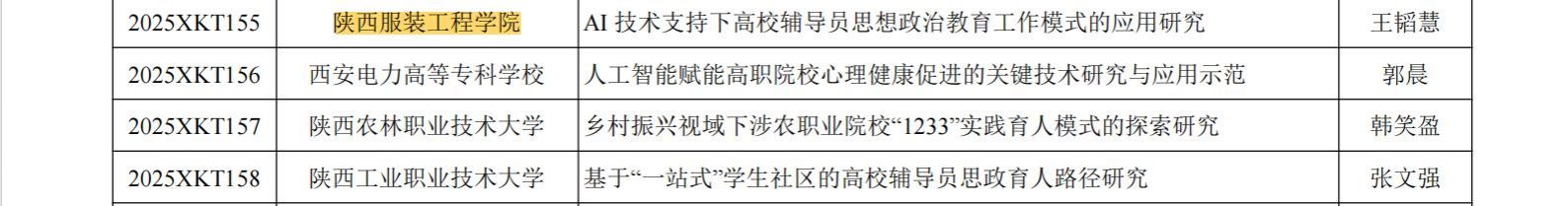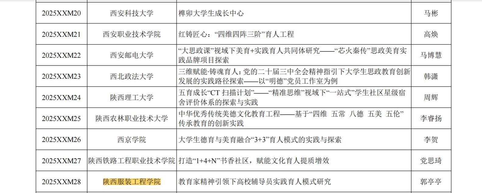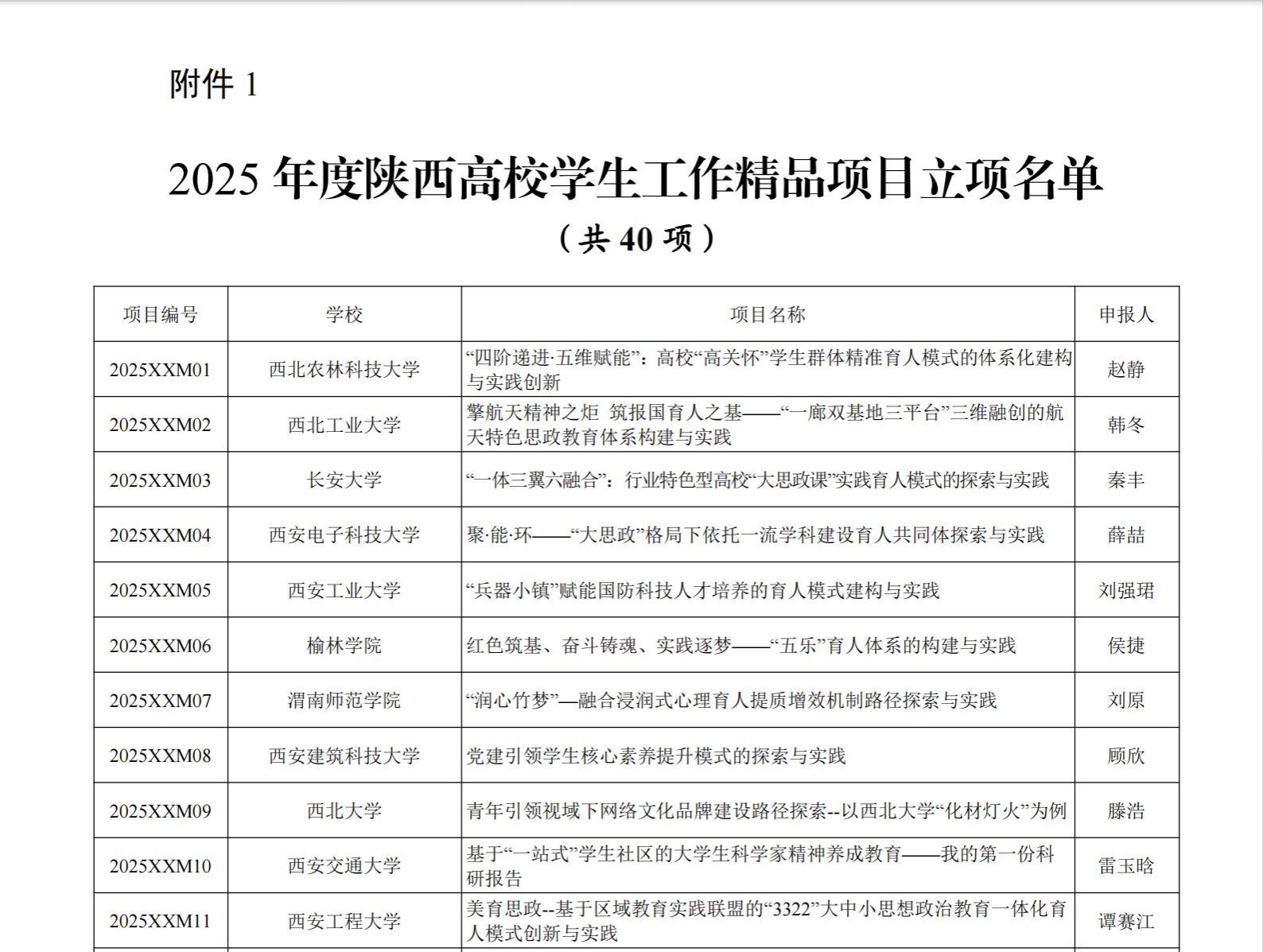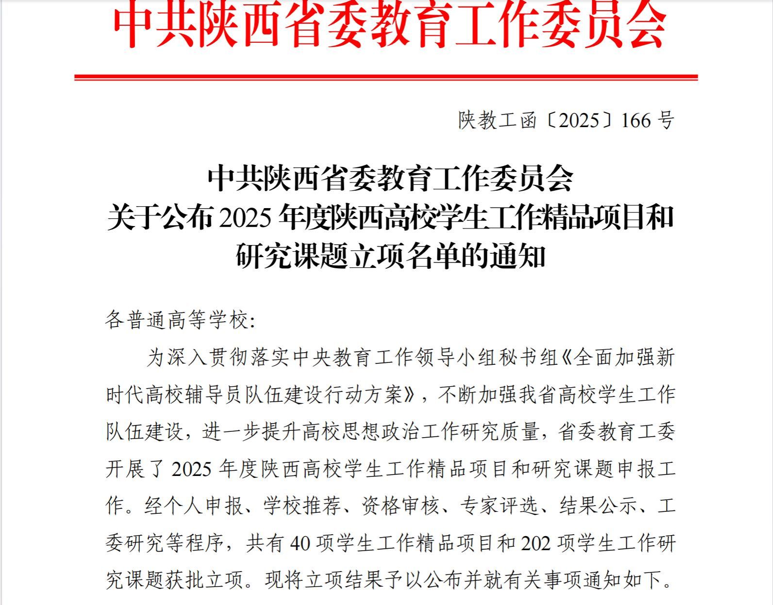 近日,陕西省委教育工委公布了2025年度陕西高校学生工作精品项目和研究课题立项名单,我校获批立项1项精品项目、2项研究课题。