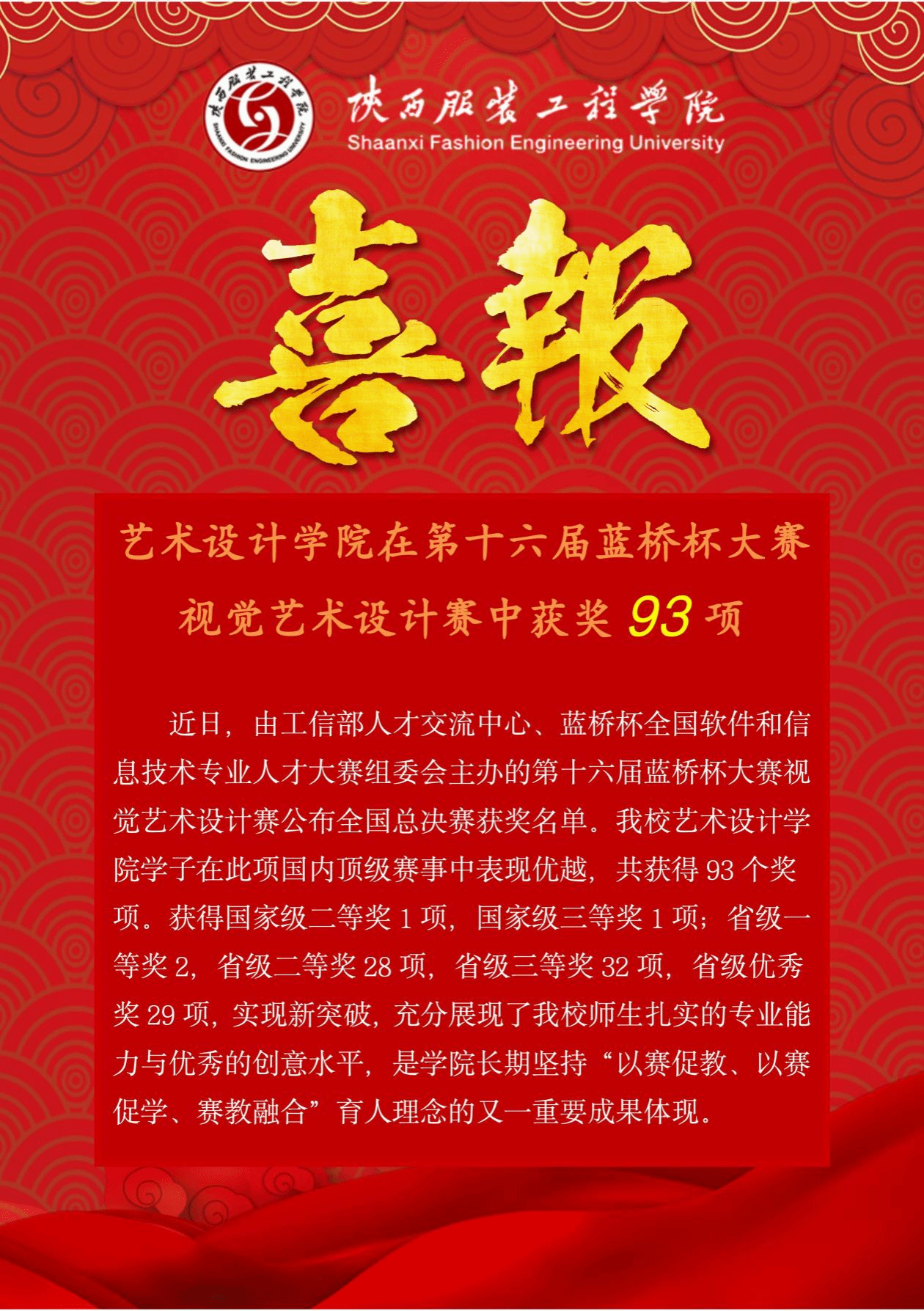近日,由工信部人才交流中心、蓝桥杯全国软件和信息技术专业人才大赛组委会主办的第十六届蓝桥杯大赛视觉艺术设计赛公示全国总决赛获奖名单。我校艺术设计学院学子在此项国内顶级赛事中表现优越,获得国家级奖项2项,其中包括二等奖1项,三等奖1项;省级奖项91项,其中包括一等奖2项,二等奖28项,三等奖32项,优秀奖29项,实现新突破。