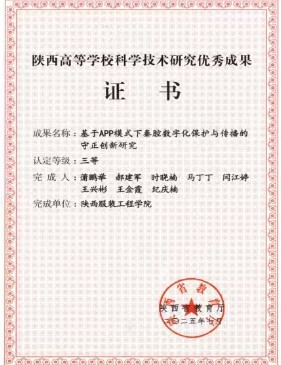 近期,陕西省教育厅公布了2025年陕西省高等学校科学技术成果奖获奖名单,我校蒲鹏举、郝建军、时晓楠、马丁丁、闫江婷、王兴彬、王金霞、纪庆楠申报的“基于APP模式下秦腔数字化保护与传播的守正创新研究”获得陕西省高等学校科学技术研究优秀成果三等奖。