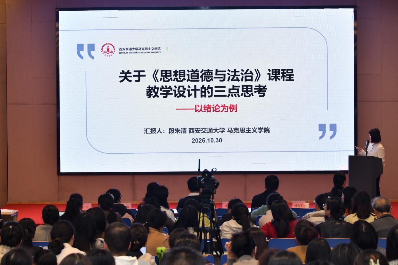 段朱清老师带来了“关于《思想道德与法治》课程教学设计的三点思考--以绪论为例”的示范课。课程首先以“为什么‘绪论’比想象中更重要”开题,让大家认识到绪论不是“铺垫”,而是整门课的“价值锚点”与“认知启蒙”,它承担着找准课程定位、建立课程信任、搭建课程框架的三重使命;接着从“以‘人生之问’找准教学起点、以‘价值辨析’重建认知逻辑、以‘成长叙事’塑造课程意义”三点思考进行课程的具体教学设计;最终达到让“第一课”成为“点燃课”的课堂效果。随后,段老师还现场讲授了《西迁精神的时代传承》公开课,课程内容精彩饱满,极富感染力。