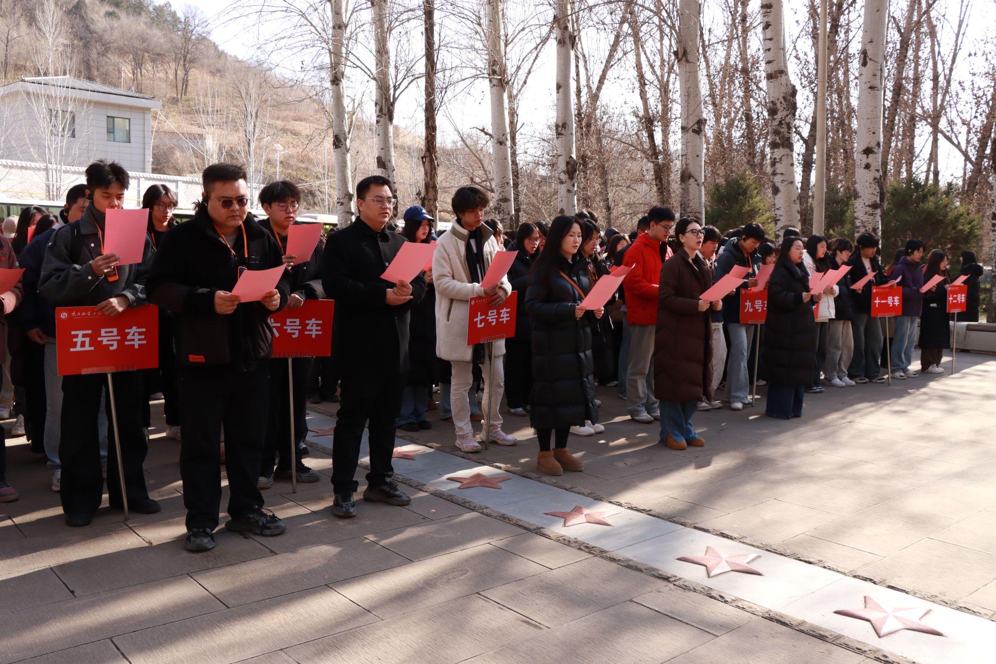 站在宝塔山上俯瞰延安城,那些曾在窑洞里点燃的星火,那些用草鞋丈量过的山河,都化作塔身上斑驳的历史印记。历史是一种穿越时空的精神力量,革命先辈们用热血和生命铸就的延安精神,将永远激励着我们砥砺前行。最后,在庄重的为人民服务广场,面对张思德同志塑像,全体成员整齐列队,在延安党校老师的带领下,齐声诵读了毛泽东同志的光辉著作《为人民服务》。朗朗诵读声,回荡在广场上空,更印刻在每个人心间。随后,党校老师以张思德事迹和《为人民服务》的精神内涵为核心,现场讲授了一堂立意高远、内容生动的思政金课,深刻阐释了“完全”、“彻底”为人民服务的根本宗旨及其时代价值,使师生们对党的性质宗旨有了更加透彻的理解和认同。